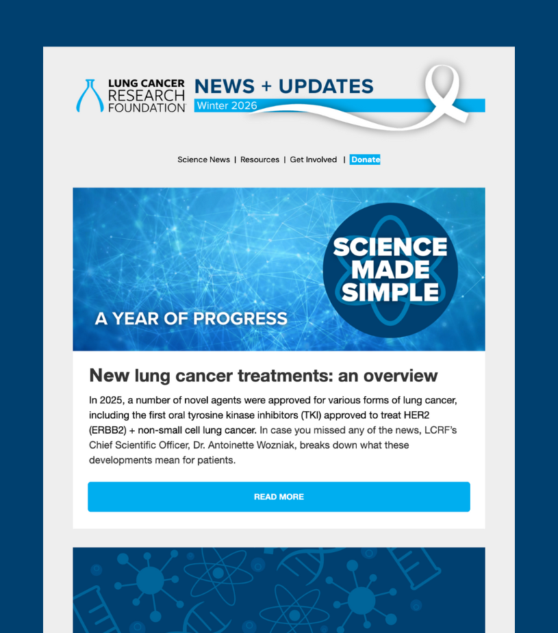 LCRF e-news October 1, 2025 LCRF publishes a quarterly e-newsletter highlighting the latest developments in the lung cancer space and announcing upcoming events. The e-news also features stories from patients and supporters. Read the latest e-news Subscribe!